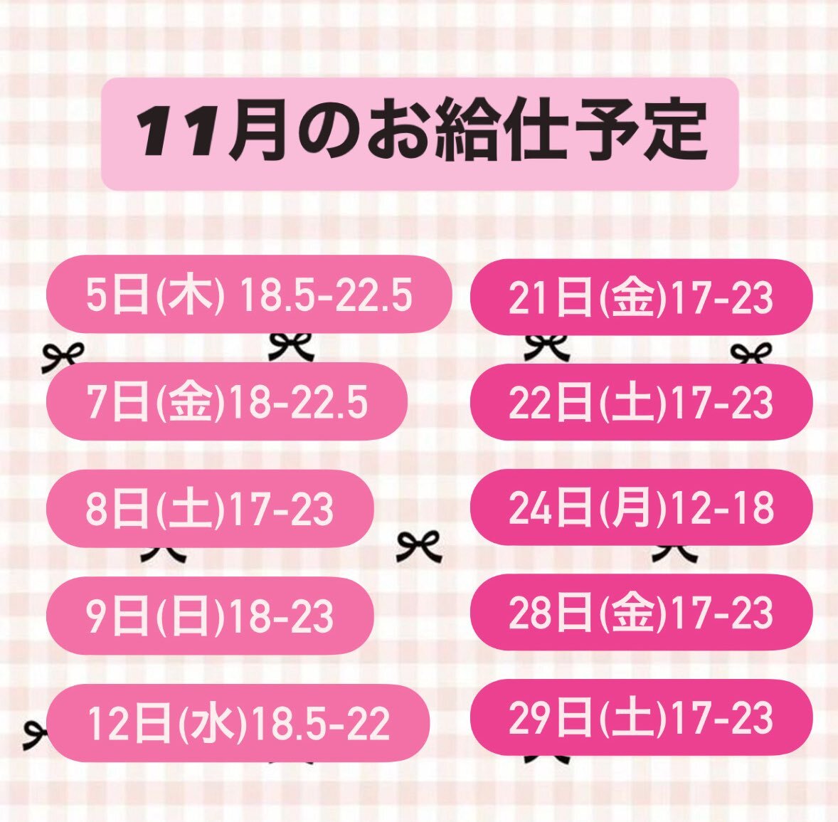 《11月のお給仕予定♡》 8日かれんさんBDイベ 9日しろはさんBDイベ 11日ポッキーの日 23.24日フリコスイベ 29日まいさんBDイベ 30日しろはさん卒業😢🪽 今月も盛りだくさん꒰ᐢ⸝⸝´ඉᯅඉ⸝⸝ᐢ꒱ 沢山リトルへ会いに来てねん🎵🎶