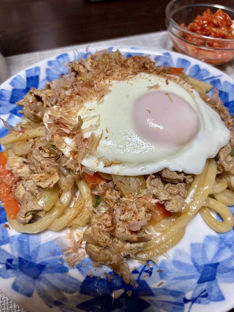 今日の晩ごはん〜10/17金 ・焼きうどん ・キムチ 冷凍うどんを使って焼きうどん。 豚肉,玉葱,人参,ピーマンの具材で、和風顆粒だし素,塩胡椒,とんかつソース,醤油で味付け。 目玉焼きとカツオ節をトッピング。 #料理好きな人と繋がりたい #おうちごはん #自炊 pic.x.com/zhGlyTwBob