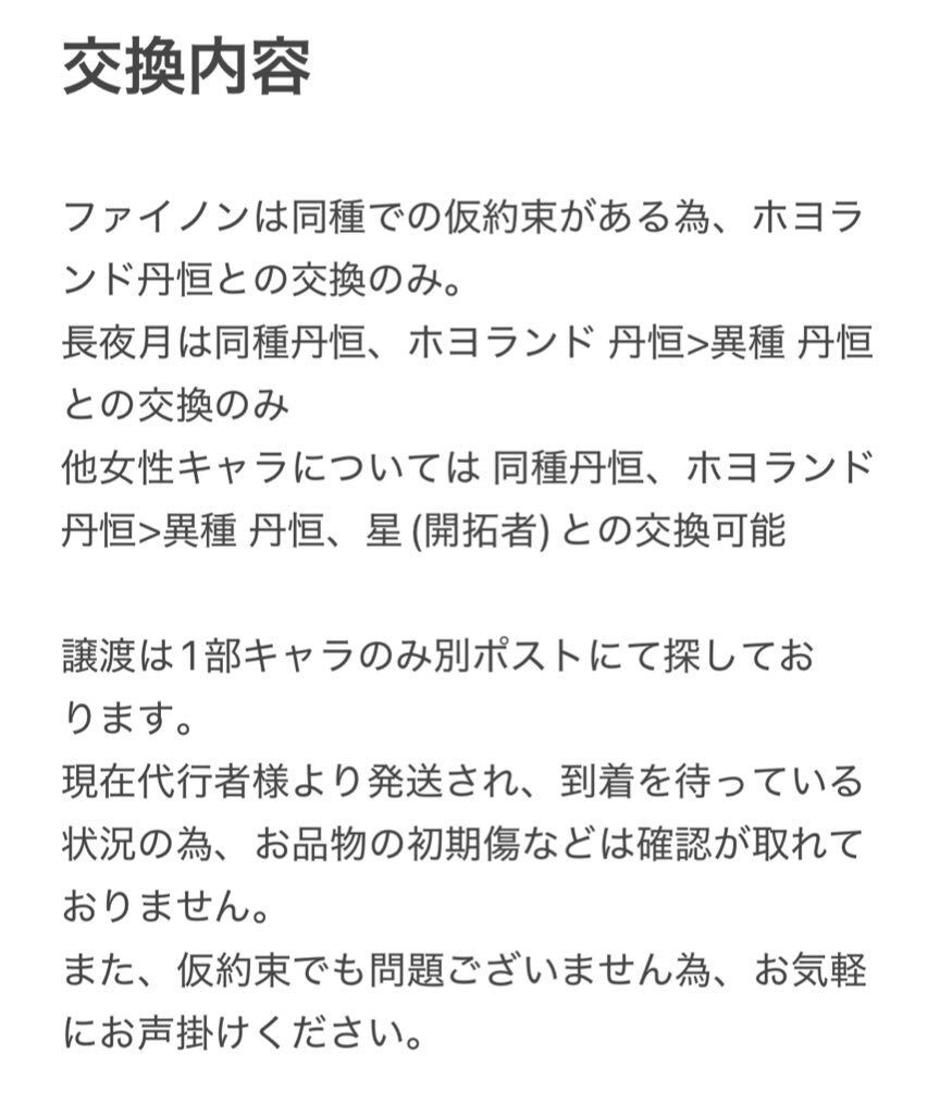 返信先:@tarioabhaこんばんは、はじめまして。お声掛けありがとうございます…! 交換はヒアンシー含む内容を希望していること、ナナシファイノンは交換を希望していることから、騰荒、花火、ケリュドラでしたらお譲り可能ですがいかがでしょうか? ご検討いただけますと幸いです、よろしくお願いいたします*