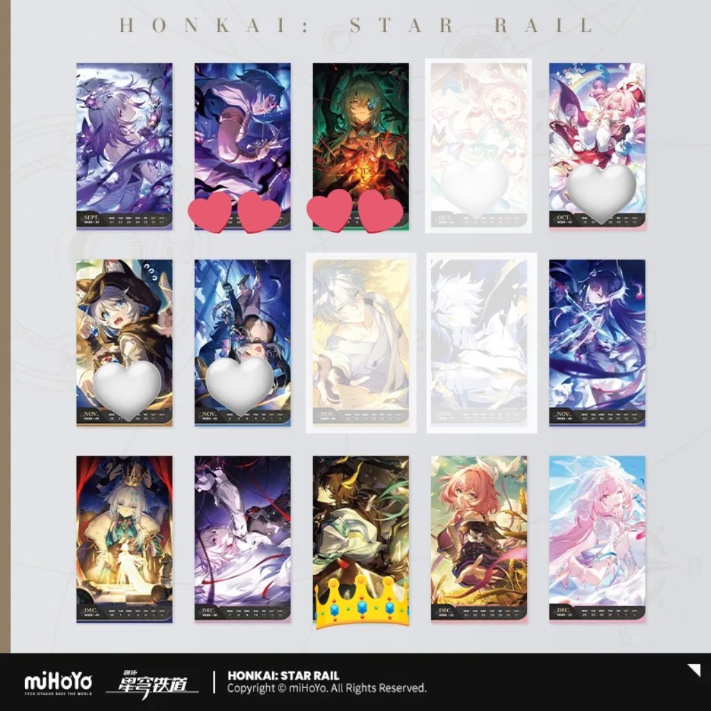 【交換/譲渡/買取】崩壊スターレイル スタレ 光円錐 カレンダー 【譲】画像👑、💕以外のもの 各2 【求】2026 丹恒・騰荒、椒丘 モゼ>星5アナイクス>ナナシアナイクス 2024 丹恒&刃、丹恒・飲月、刃、景元 または50/枚+送料 ・郵送のみ ・求は買取もしております◎ ・一部お声掛けあり
