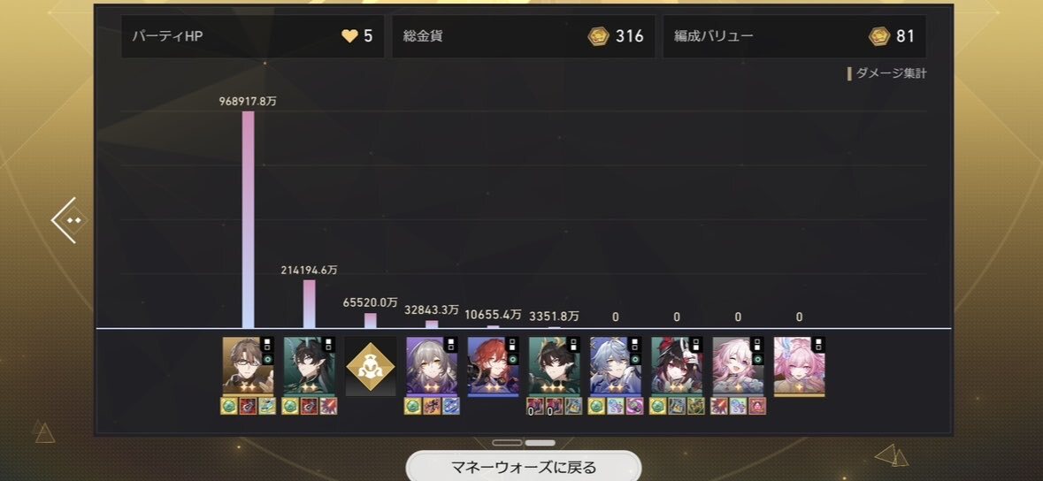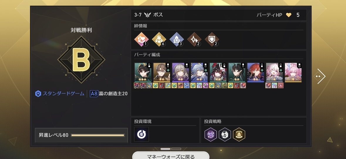 マネーウォーズ富の創造主20、列車組を使ってぎりぎりクリア。 やっぱりヴェルトが頼りになる。 騰荒は速すぎると無駄にバリア連発して微妙な気がする…落ち着いて丹恒。 pic.x.com/BgPyRwF6Gx