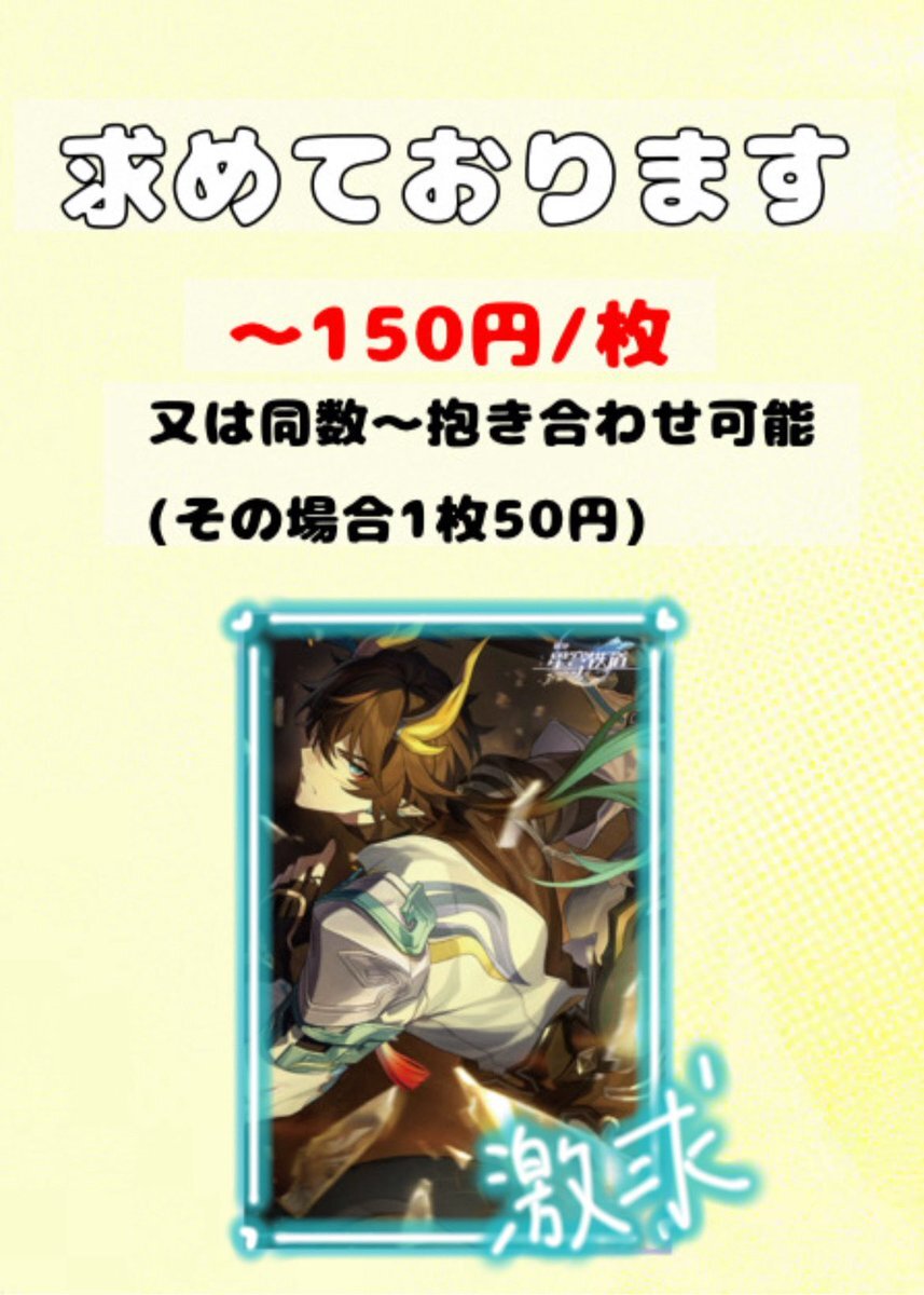 @not_tl 崩壊スターレイル スタレ 光円錐 カレンダー 買取 【求】 丹恒・騰荒 【譲】 ~150円/枚 抱き合わせありの場合50円/枚 ~倍数可能。 別ポストにて交換も探しております為、決まっていないキャラクターとの交換も可能です。 希望数揃い次第〆ます。 pic.x.com/EWPGXlm49E