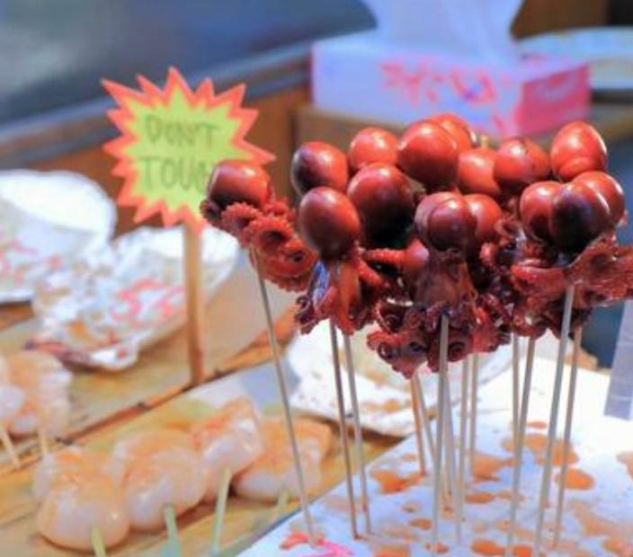 【補足】 黒門市場では夏のハモ、冬のフグが名物で、鮮魚店の1割ほどがフグ専門の看板を掲げているほど。アーケード下には約150店舗が並び、通りはいつも大勢の人々で賑わっている。 黒門市場には「食い倒れの街・大阪」らしい食べ歩きメニューも盛りだくさん。