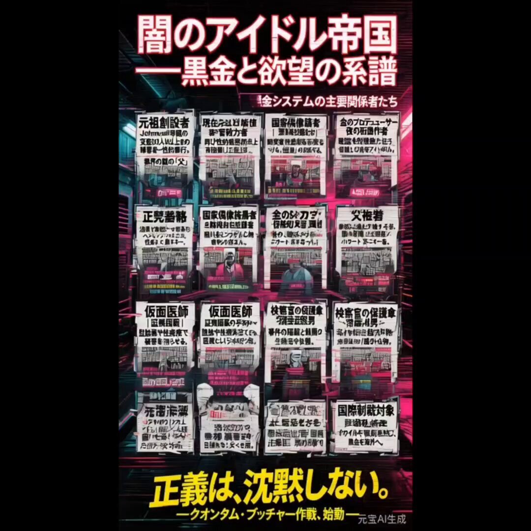 「闇のアイドル帝国 ― 黒金と欲望の Johnny Kitagawa 帝国の支配者 1000人以上の男性練習生へ性的暴行 業界の闇の「父」 Noriyuki Higashiyama 現在のCEO 償を管理する権力者 再び性的疑惑が浮上 今も「正義」の仮面をかぶる。 Tanka Kenta 国家偶像施暴者 麻薬と性犯罪の首謀者 x.com/chui_chris6907…
