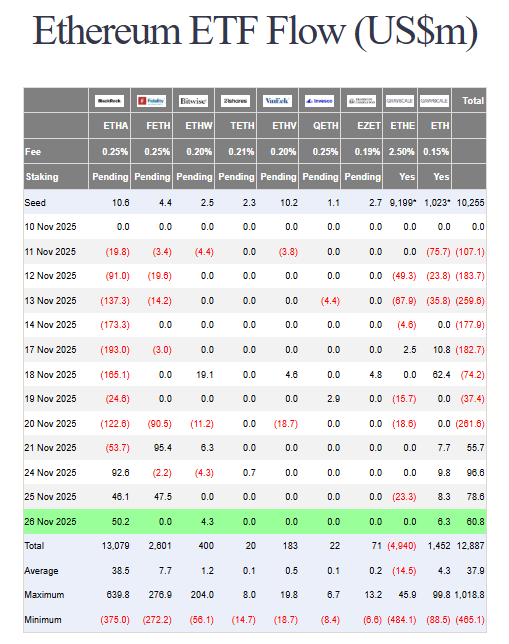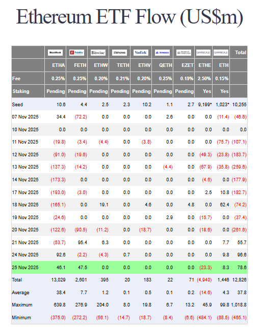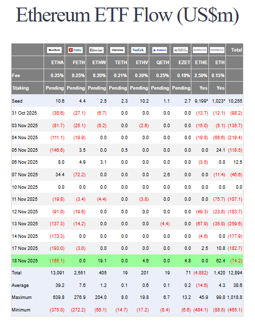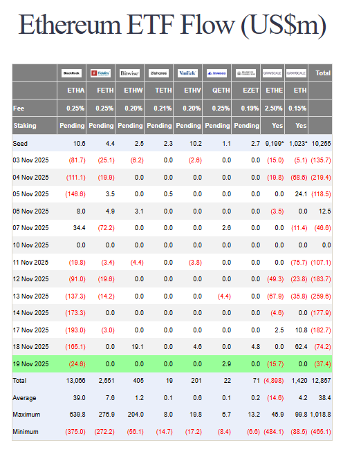 $ETH 現物ETF、7日連続の純流出📉(SoSoValue) 11月19日のデータ - 純流出額:3735万1800ドル💸 - 現在の純資産総額:181億9400ドル - $ETH 時価総額に占める割合:5.12% - 累積純流入額:128億3800ドル AI補足:11月10~14日の週間純流出は7億2900万ドルで過去3番目の規模📊 x.com/14166806661843…