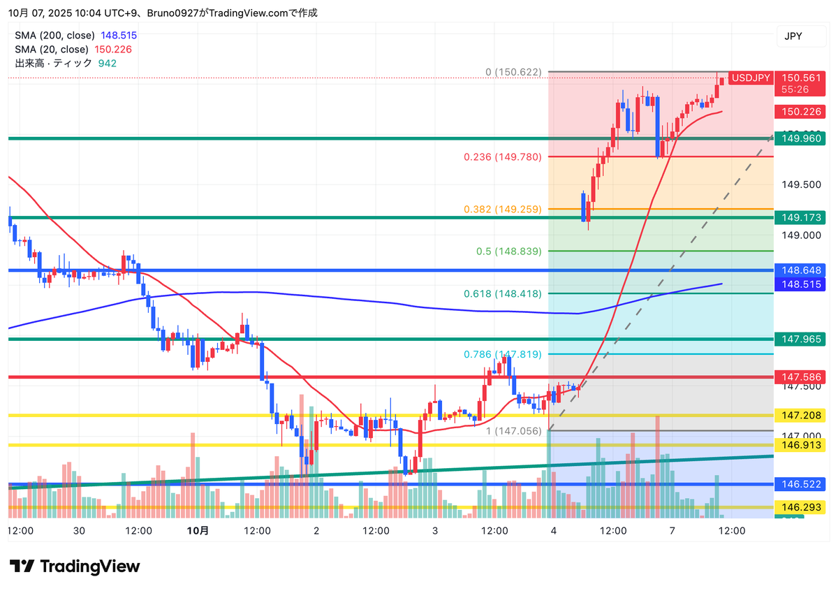 ドル円 高市新総理誕生に反応 一時150円まで上昇 148円台で推移 150円って上げすぎでしょ〜ψ(`∇´)ψ まぁ ショート仕込むポイントを探りますけどね