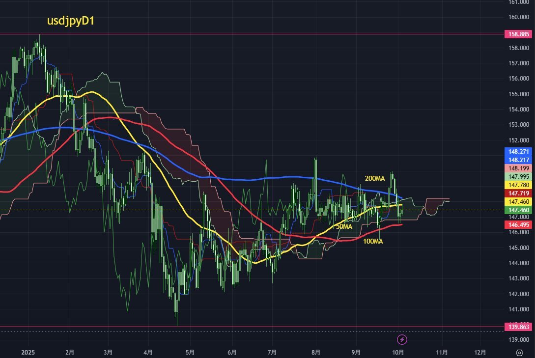 今週のドル円 テクニカル的に日足では50SMAが147.7円付近で抵抗に、100SMAは146.3円付近でサポート。200SMAは148円台前半に位置。各SMAがきれいにサポートとレジスタンスに。レンジ継続も足元上昇トレンド。一目均衡表では雲中推移。短期的には押し目買い優勢だが、149円台後半の前回高値は意識。 pic.x.com/IGaaekVsYt