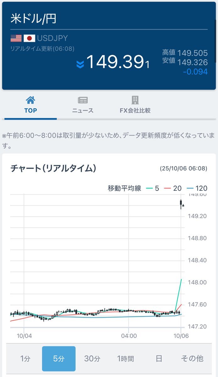今週のドル円 今週のドル円は148円台前半で始まり、米長期金利の上昇を背景に一時149円台後半まで上昇。日銀の介入警戒感が意識される中、週末には148円台へ反落。高値警戒と米雇用統計前のポジション調整が重なり、上下に振れる展開となった。 pic.x.com/ccCrNyvnOS