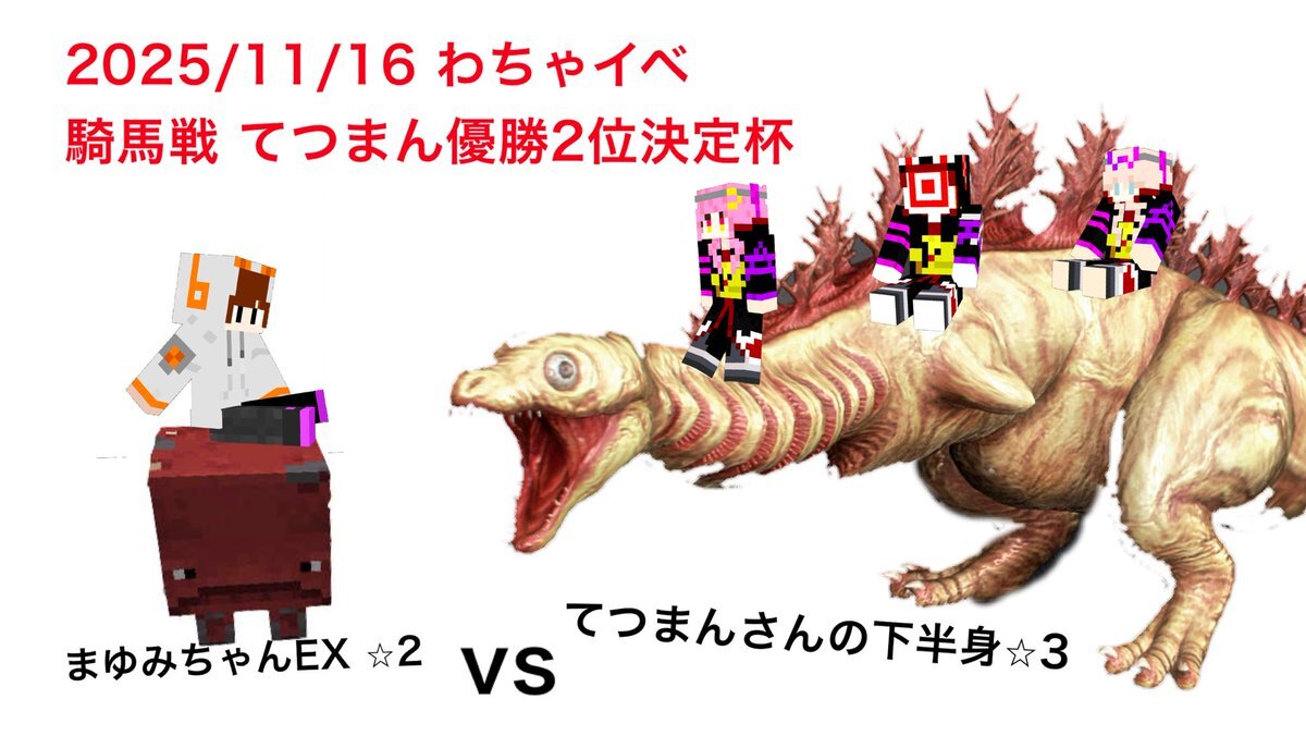 明日21時〜 わちゃいべ 騎馬戦 明日はみんな大好きてつまんさんが 諸事情で参戦できないそうなので 優勝。ので2位決定戦を行います。 ランダムに選ばれた相棒に それぞれ騎乗していただき 死ぬまで殴り合ってもらいます。 本戦はトーナメント戦 エキシビションマッチは バトルロワイヤル形式 #J鯖 pic.x.com/ogIJXiNcDo