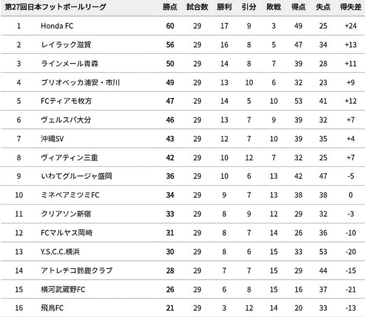 【JFL 速報】 #JFL #HondaFC #レイラック滋賀 #ラインメール青森 Honda FCが武蔵野を下し2位以内確定。滋賀は岡崎と引き分け2位以内決定は持ち越し。青森が明日引き分け以下の場合は滋賀の2位以内が確定する jfl.or.jp/jfl-pc/sokuho2…