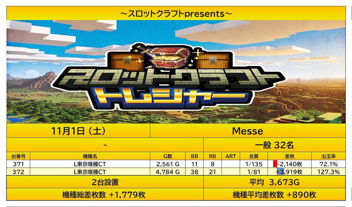 11/1【栃木県】 #Messe #メッセ 『合同トレジャー結果』 ■編集部考察 ・46枚貸し全機種が注目 ✵東京喰種/出玉率108.1% 大人気機種が全7店舗 合計52台の圧巻大仕掛け 全店総力結集のスタートダッシュ まだ伸びしろありの穴場店舗 PR *調査HP pachislo-friends.com x.com/PStomowoyobu/s…