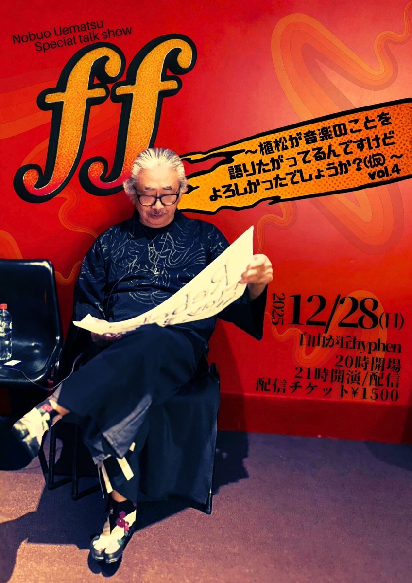 🎹『ff〜植松が音楽のことを語りたがってるんですけど、よろしかったでしょうか?(仮)〜vol.4』 店内観覧チケット 11/28(金)21:00〜予約開始! 今回のテーマは FF5。植松伸夫氏が制作秘話や当時の空気感を語る❗️ 📅12/28(日)20:00開場/21:00開演 📍自由が丘hyphen nobiyo-ff4-hyphen.peatix.com
