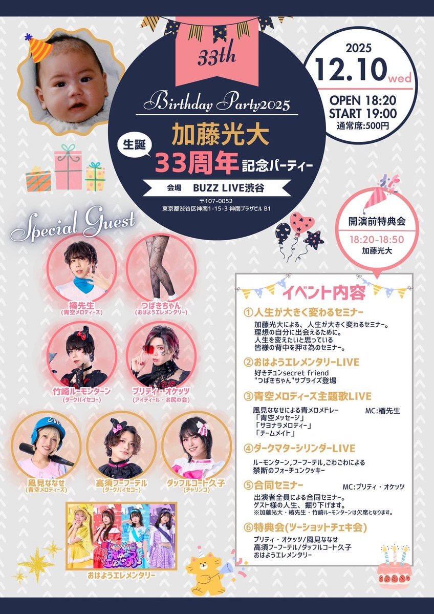 【"加藤光大"生誕33周年記念パーティー】 ◇開催日時 2025年12月10日(水) 開場18:20 開演19:00 ◇パーティー会場 BUZZ LIVE 渋谷 ◇SPECIAL GUEST 椿先生(青空メロディーズ) つばきちゃん(おはようエレメンタリー) 竹崎ルーモンターン(ダークバイセコー) pic.x.com/Qic8aSE2sv