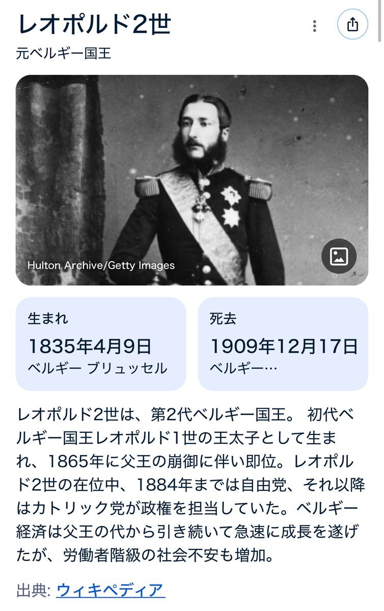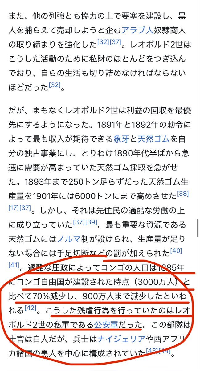 ベルギーのレオポルド2世、ヤバいね。 人口3000万人のコンゴで、900万〜1500万人を殺したみたいな話。 AIによると、ナチスの犠牲者が合計1000万人くらいかな。 知らない歴史がまだまだいっぱいあるなあ。 pic.x.com/cQlwi4CaqX x.com/zoomafrika1/st…