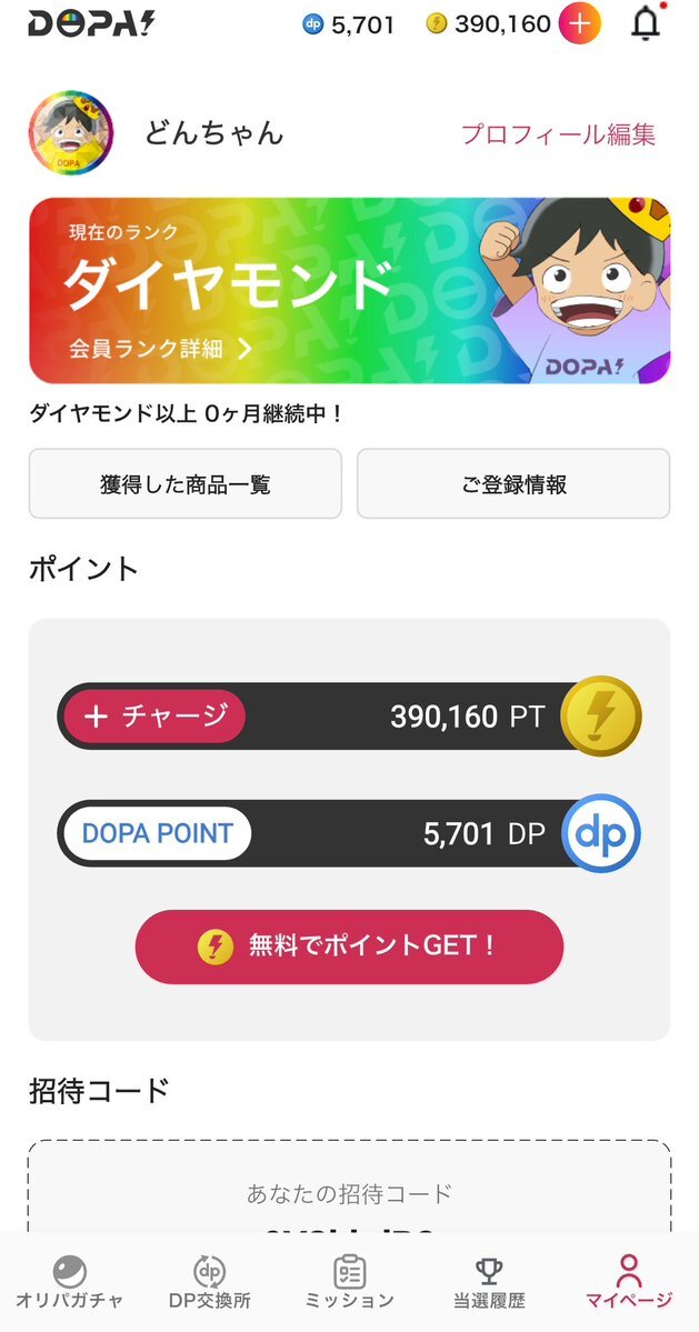 オリパ引くならDOPA! bit.ly/3PVbdlu 友達紹介キャンペーン中⚡️ 友達が新規会員登録時に招待コード入力で、紹介した人/された人2人ともポイント付与! さらに!友達がポイントを購入すると追加で2人ともポイントが貰える! 詳細はDOPAマイページへ👌 招待コードはこちら↓↓ R4MgRsoM