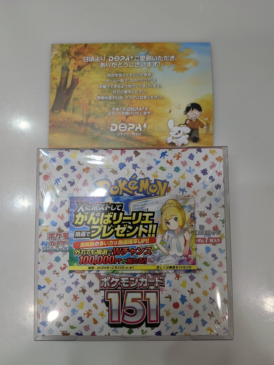 @dopa_oripa #DOPAオリパ #DOPA当選報告 #がんばリーリエ抽選でプレゼント DOPAありがとう🎉 ポケモンカード151ゲットだぜ👍 がんばリーリエ欲しい✨ pic.x.com/iqNDrX2pvP