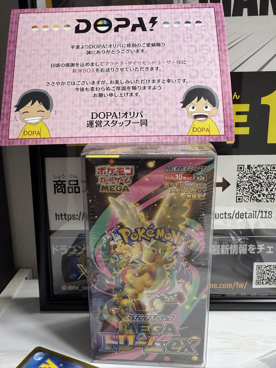 @dopa_oripa #DOPAオリパ #DOPA当選報告 DOPA!にて久しぶりに大当たり🎯引けました❣️キタ━(゚∀゚)━! 新弾のハイクラスパックMEGAドリームex1BOX〜💖 めっちゃ嬉しい😊 開封結果もポスト出来たらポストすると思います♪ pic.x.com/gMMh0VyHDu