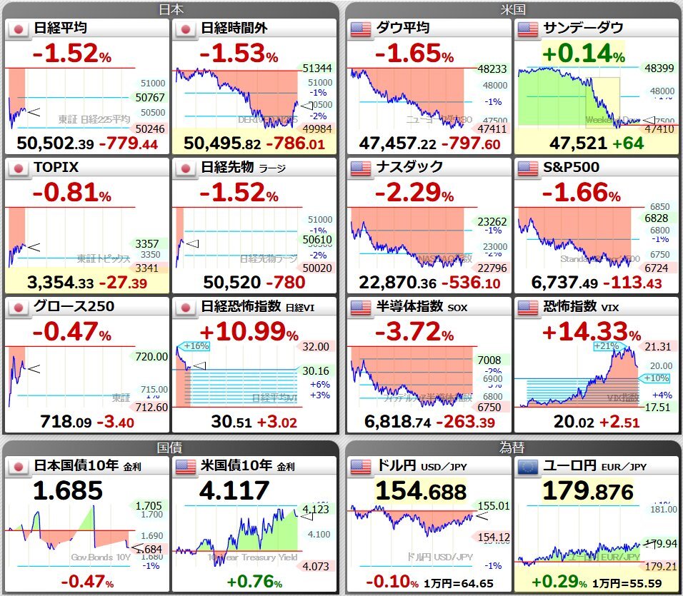 まず米国株だけど、FRBの利下げ観測が後退して一気に重くなった NYダウは ‐797.60ドルの47,457.22ドル、5日ぶり反落。 S&P500はエネルギー以外ほぼ全滅で ‐113.43ポイントの6,737.49。 ナスダックは半導体が売られて ‐536.10ポイントの22,870.36、3日続落。 原因はFRB高官の発言ラッシュ。
