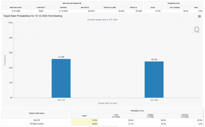 12月の米利下げ確率、約51%に低下⚠️ ✅FRB高官の慎重コメント増で利下げ期待が後退 👉株価の重しになる可能性 📊推移 ・1か月前:ほぼ100% ・1週間前:約70% ・現在:約51% pic.x.com/rXc2BCES2J