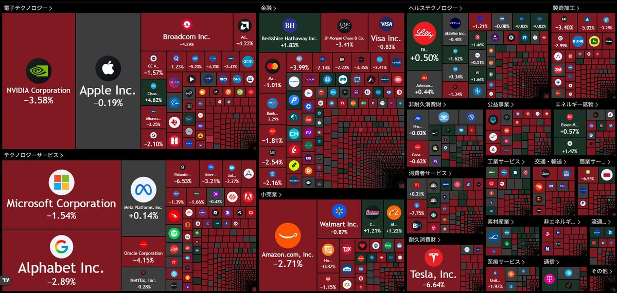 米株が急落。ナスダックは利下げ期待後退とテック株の割高感で2%安、ダウも大台達成後の調整で大幅下落。パランティアやエヌビディアなど主力株が売られ、FRB高官の慎重姿勢で12月利下げ観測が低下し、利益確定売りが加速。相場全体の警戒感が強まった。