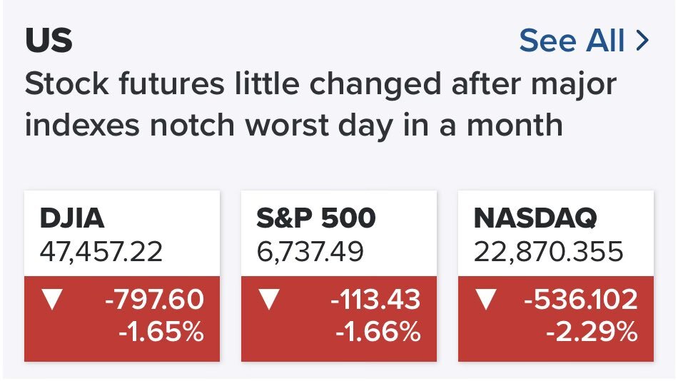 🇺🇸大幅下落 🐯大統領の署名で政府機関再開し材料出尽くし下落📉 AIバブル懸念でハイテク売られディズニーDISがダウの重し FRB高官タカ発言で利下げ期待後退し続落📉 🐯政権ベネズエラ侵攻が懸念材料となり終盤下げ幅拡大 続く pic.x.com/uscmLWQb4x