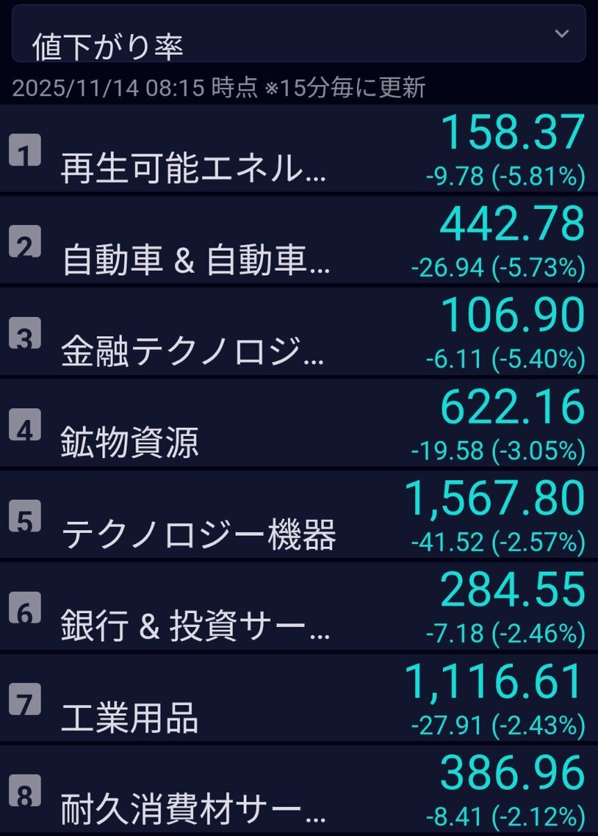 【日経平均は大幅反落】2025年11月14日(木) 終値は-905円の50,376円。米株急落を受け全面安気配、半導体中心に大きく売られる展開。 【ポイント】 ・ダウは-797ドル、ナスダックも大幅安 ・FRB高官発言で利下げ期待後退 ・半導体に広範な売り、指数寄与度の高い銘柄が軟調