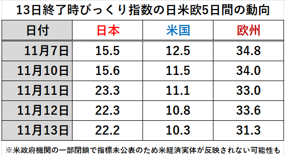 シティグループが経済指標等の結果から算出しているストラテジー指数のエコノミックサプライズ(びっくり指数)の動向です。各種経済指標が事前の市場予想と比べてどうだったかを指数化したもので、実績が予想を上回れば指数は上昇、逆に下回れば下落する仕組みです。日米欧の過去5日間の推移です。