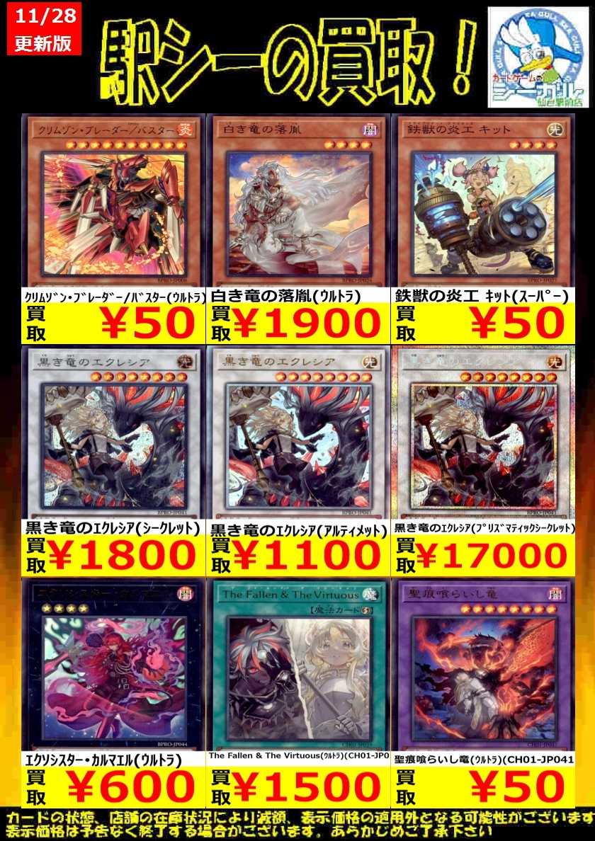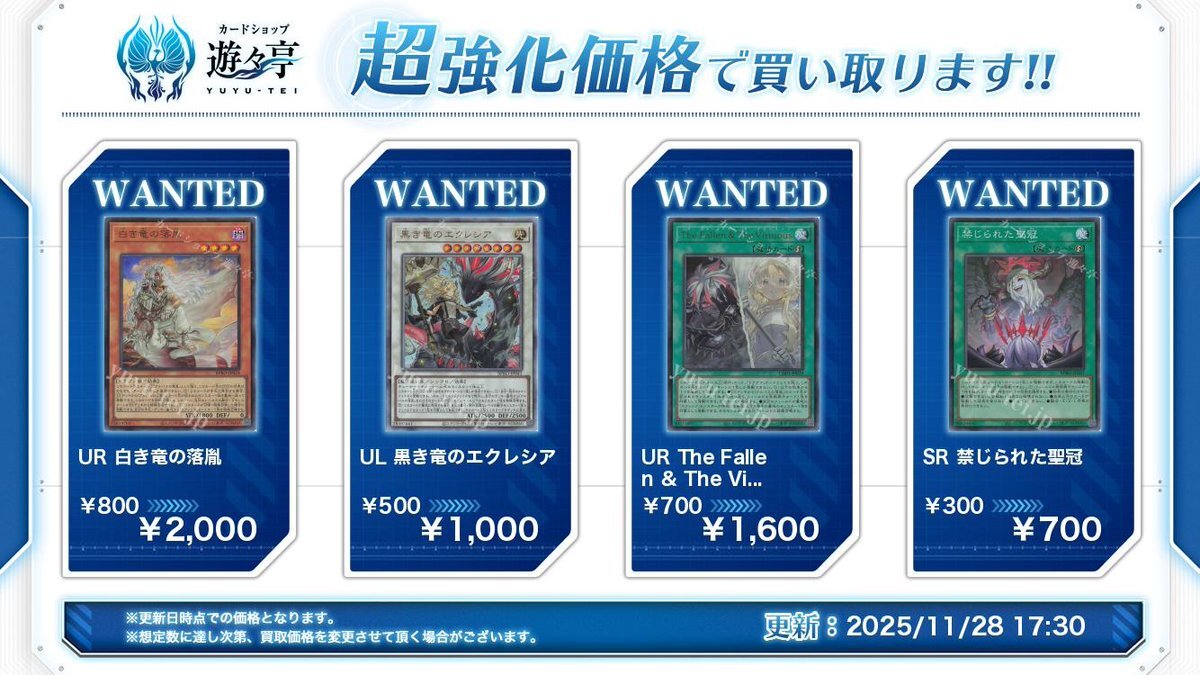 【遊戯王 買取情報】11/28 白き竜の落胤 黒き竜のエクレシア The Fallen & The Virtuous 禁じられた聖冠 買取強化中! 買取強化中の買取特集はこちら! yuyu-tei.jp/buy/ygo/s/sale pic.x.com/F6nlzGczfp