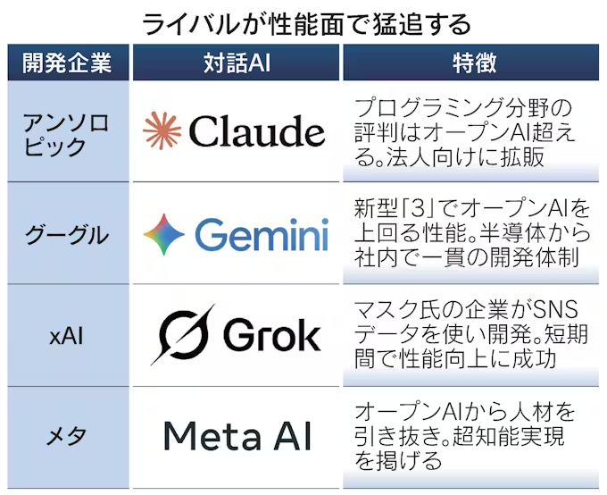 Google がライバルだと簡単じゃないね OpenAI、ChatGPT開始3年で企業価値25倍 赤字でも220兆円投資 nikkei.com/article/DGXZQO… ・無料会員が95%、大幅な赤字続く ・揺らぐ優位性、グーグルやメタが総力挙げ対抗 ・18日発表の新型AI「Gemini3」は最新モデル「GPT-5.1」を超える性能を実現との見方 pic.x.com/coSN2Ksdm9