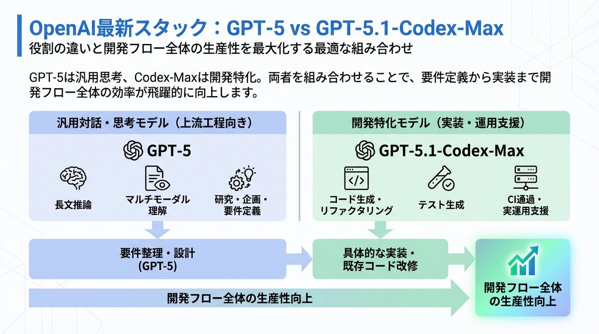 GPT-5とCodexは、ともにOpenAIの最新スタックですが役割が異なります。GPT-5は「汎用対話・思考モデル」として長文推論やマルチモーダル理解に強く、研究・企画・要件定義など上流工程向き。一方GPT-5.1-Codex-Maxはコード生成・リファクタリング・テスト生成まで踏み込んだ「開発特化モデル」で、CI通 pic.x.com/nnAFWiNSdp