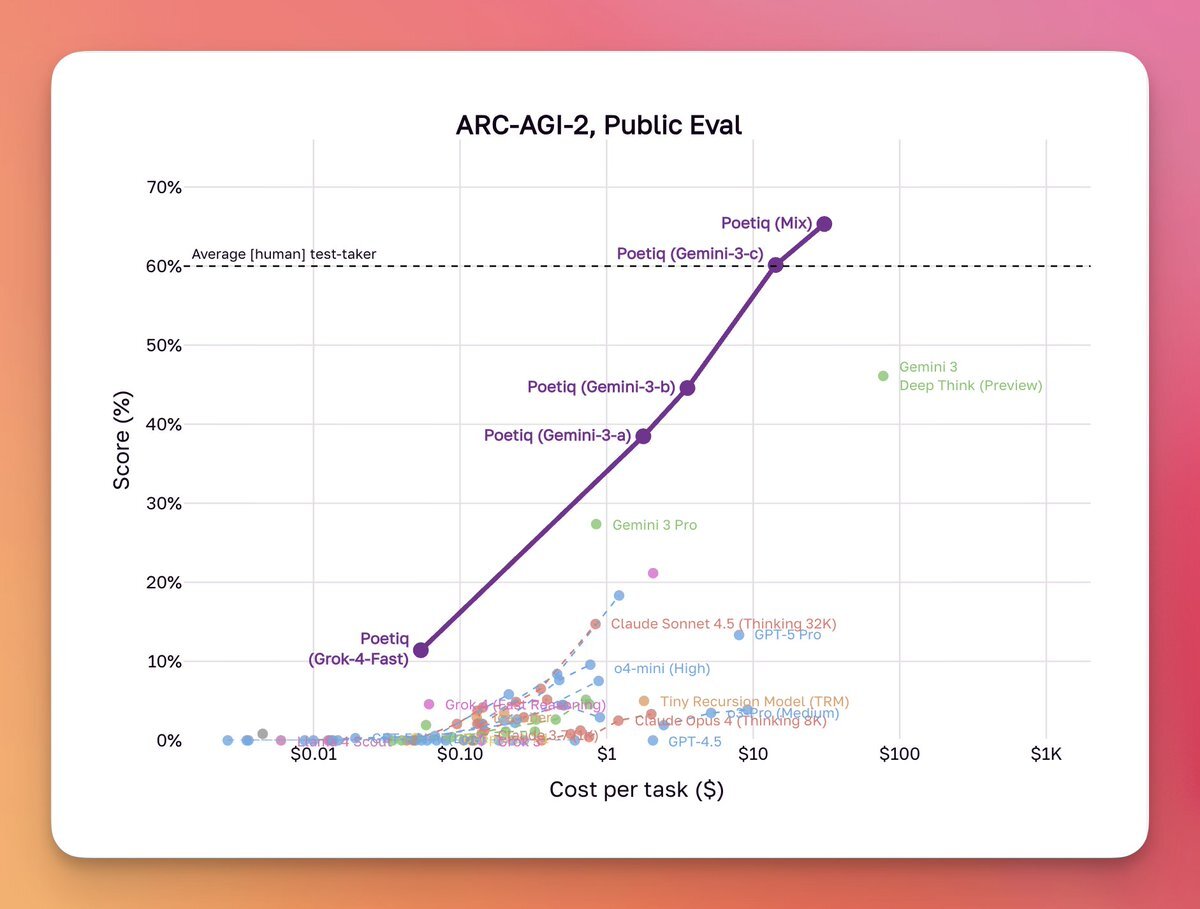 This is a *BIG* deal. Poetiq achieved superhuman performance on ARC-AGI-2 at ~$50/task using a mix of GPT-5.1 and Gemini 3 Pro. Current models are powerful enough to reach AGI. They just need the right agent scaffold.