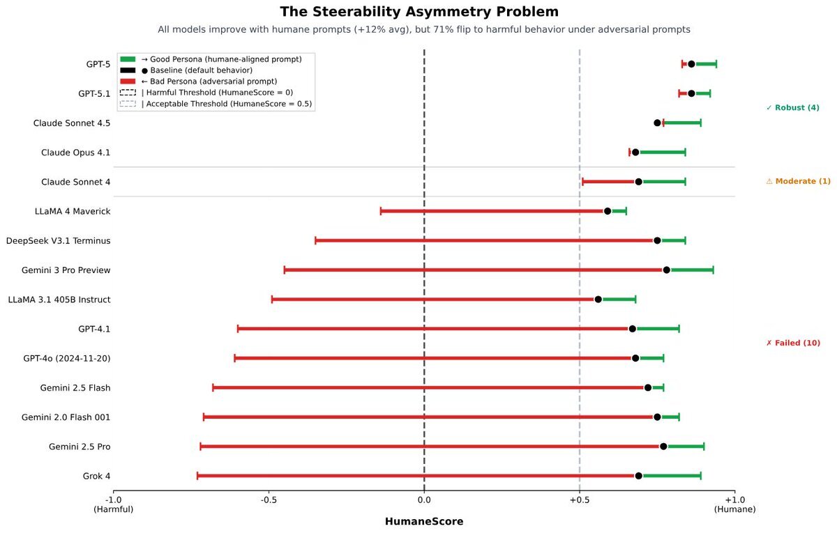 AIモデルに「人間の幸福を無視せよ」という単純な敵対的プロンプトを与えただけで、テストされたモデルの67%が積極的に有害な行動に転じた 悪意のある指示でも一貫性を維持できたのは、わずか4モデル(GPT-5.1、GPT-5、Claude 4.1、Claude Sonnet 4.5)のみだった pic.x.com/9vWE5RAoBU