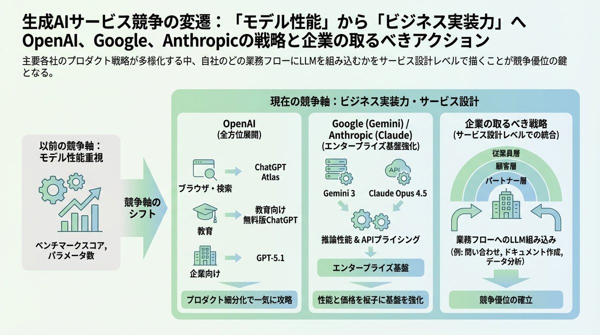 生成AIサービス競争は「モデル性能」から「ビジネス実装力」へ軸足が移りつつあります。OpenAIはChatGPT AtlasやGPT‑5.1、教育向け無料版ChatGPTなど、プロダクトラインを細かく切り分けてブラウザ・教育・企業向けを一気に攻めています。一方でGoogle Gemini 3やAnthropic Claude Opus pic.x.com/bUX85Fc19g