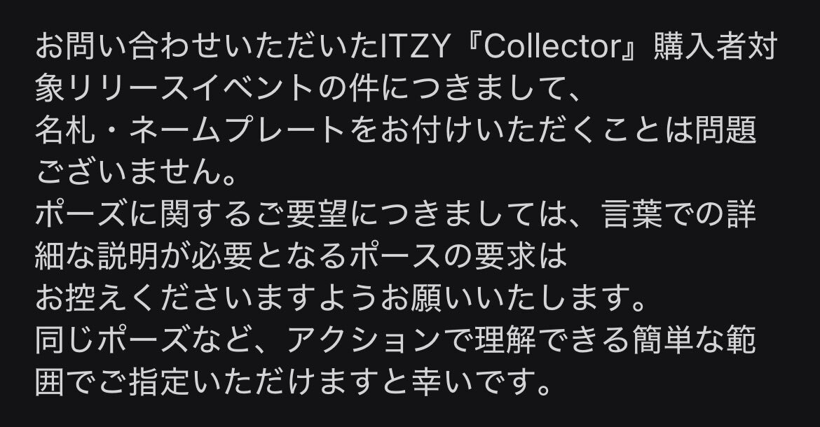 ITZYオフイベでの名札、絶対ダメって返答くると思ってたけど大丈夫ぽい🥹 ツーショもどの程度で"過度なポーズ要求"として判定されるのか聞いてみたけどこんな感じらしい😌 pic.x.com/fWHgT3zEVB