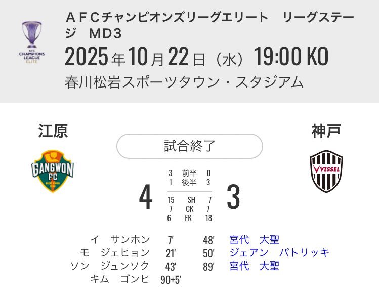 江原vsヴィッセル神戸だけどゴニが後半ATに決めてて嬉しい半面Jリーグ勢も応援してたから複雑...