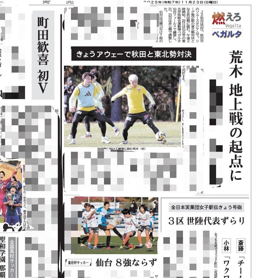 11月23日の河北新報(のスポ面)です🌅 J2仙台は14時からアウェー秋田戦。 勝利して7位磐田が敗れると、J1昇格プレーオフ圏の6位以上が確定する重要な一戦です 前回対戦は1-0。ロングボールの蹴り合いになってリズムを失いながらも逃げ切りました。 注目は「攻撃の潤滑油」右SHの荒木です! pic.x.com/cuA5JYCMG9
