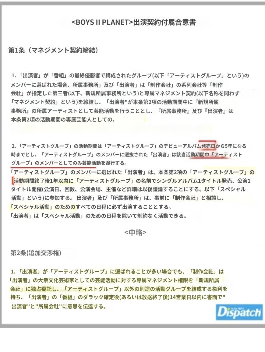 もう一回ボイプラ契約書(ディスパッチが入手したもの)を見てたんだけど放送終了後から14営業日以内に事務所と出演者に交渉ってなってるから来週の木曜日(10月16日)までにMネ?ウェイクワン?が交渉して、それから調整なら派生グループの発表はまだまだ先ですね… pic.x.com/nLn37jfgCj