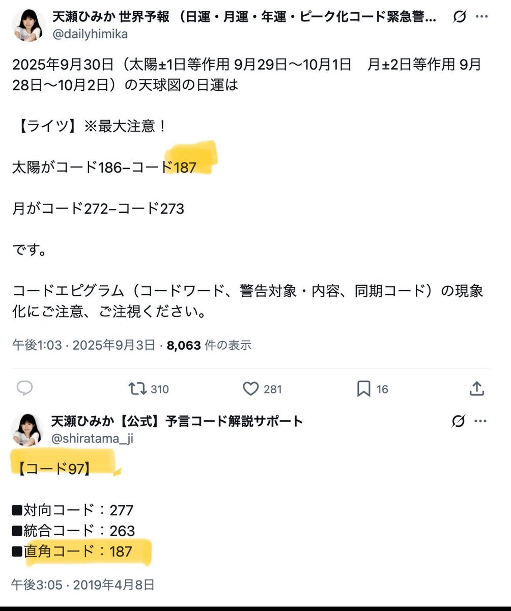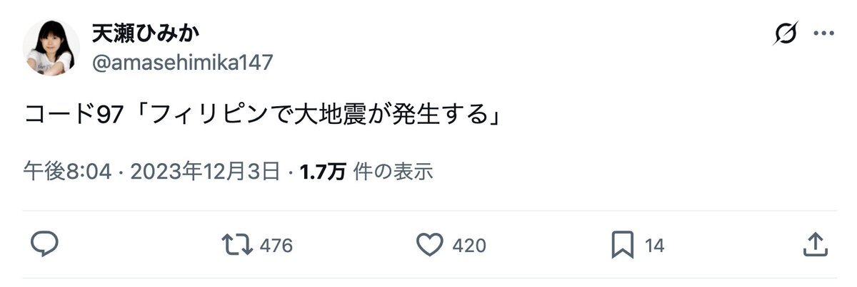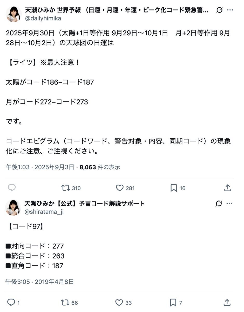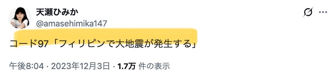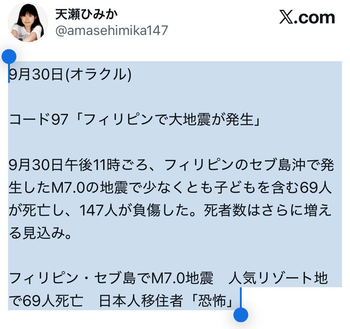 9月30日(オラクル) コード97「フィリピンで大地震が発生」 9月30日午後11時ごろ、フィリピンのセブ島沖で発生したM7.0の地震で少なくとも子どもを含む69人が死亡し、147人が負傷した。死者数はさらに増える見込み。 フィリピン・セブ島でM7.0地震 人気リゾート地で69人死亡 日本人移住者「恐怖」 pic.x.com/vQCSqJC4il