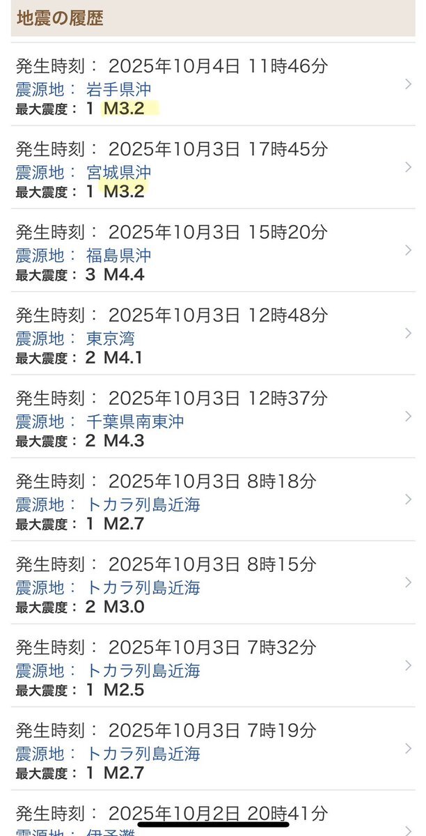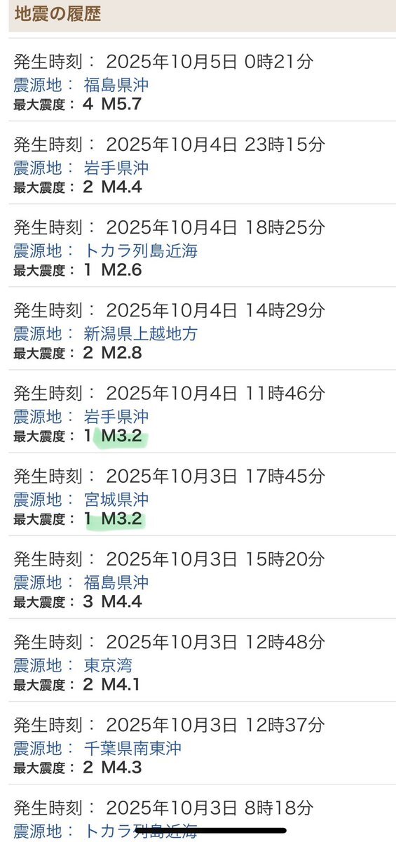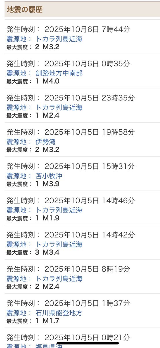 2025年10月2日まとめ 現時点の有感地震は5回 伊予灘M3.5 トカラ列島×3回 岩手県内陸北部M3.0 フィリピンM7.0発生の後もチッチ音が収まらず、更に回数が増していて、海外大き目溜め込み警戒継続です。 とくに台湾~宮古島周辺は今後影響が出るかもしれないので注意 pic.x.com/VVApaVDkTD