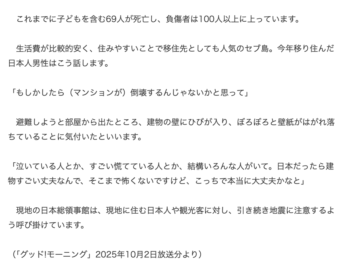 フィリピン・セブ島でM7.0地震 人気リゾート地で69人死亡 日本人移住者「恐怖」【もっと知りたい!】【グッド!モーニング】(2025年10月2日) youtu.be/xcOghJTMMVo?si… @YouTubeより