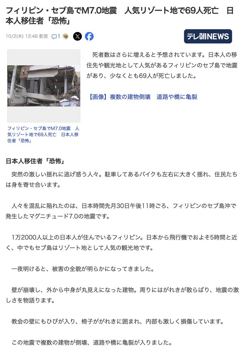 フィリピン・セブ島でM7.0地震 人気リゾート地で69人死亡 日本人移住者「恐怖」(テレビ朝日系(ANN)) news.yahoo.co.jp/articles/75106…