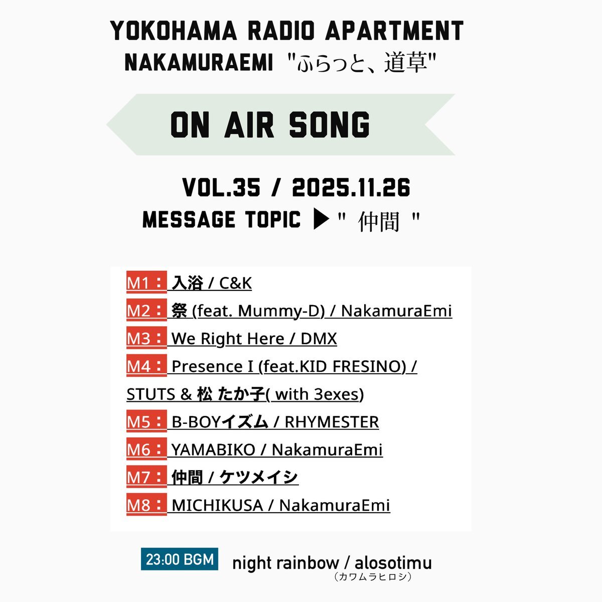 #ふらみちONAIR M1: 入浴 / C&K M2: 祭 (feat. Mummy-D) / 私 M3: We Right Here / DMX M4: Presence I (feat.KID FRESINO) / STUTS & 松 たか子( with 3exes) M5: B-BOYイズム / RHYMESTER M6: YAMABIKO / 私 M7: 仲間 / ケツメイシ M8: MICHIKUSA / 私 #FMヨコハマ #ふらみち pic.x.com/s0MuhXedx1