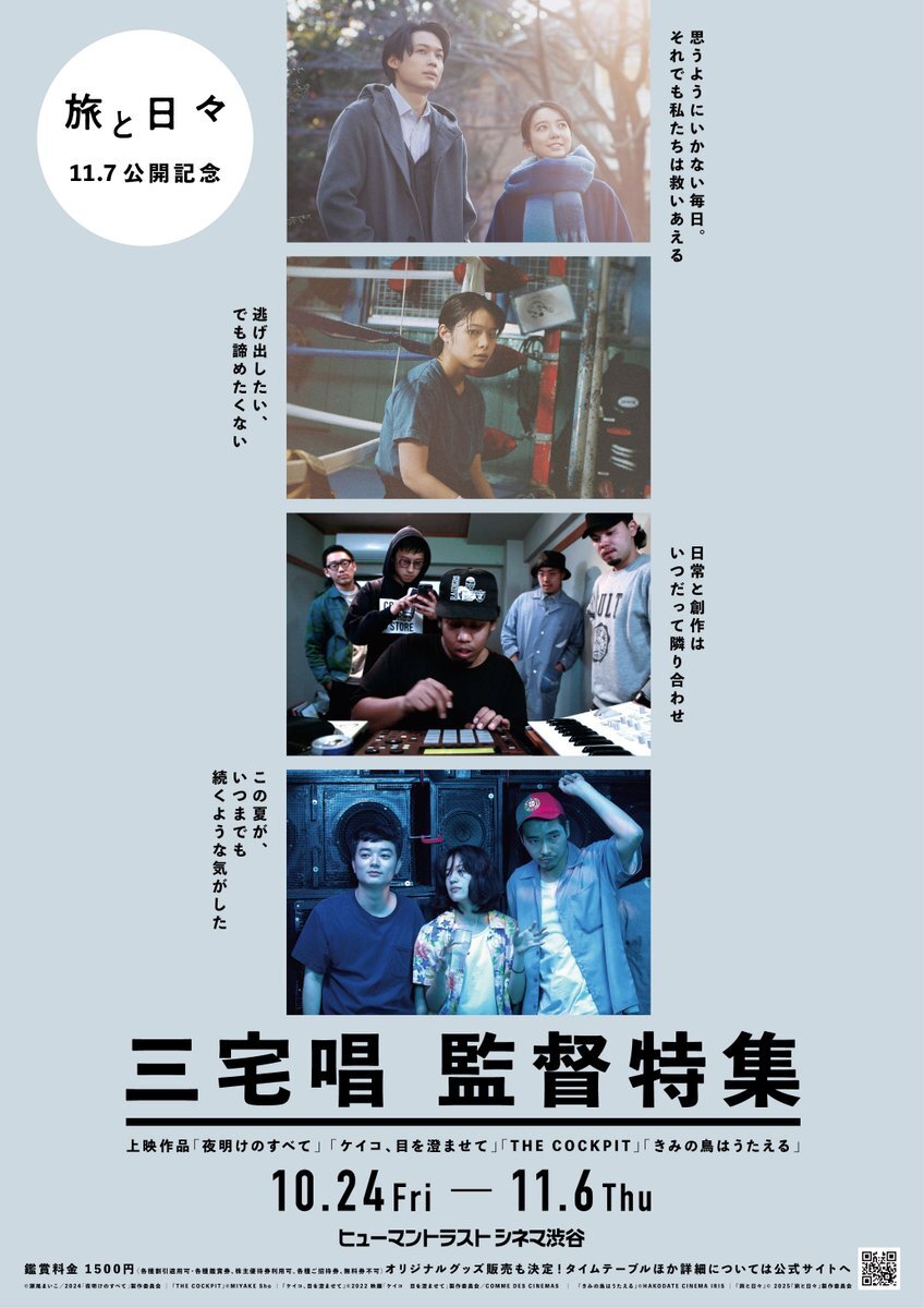 ⛄ ┈┈┈┈┈┈┈┈┈┈┈┈ 『#旅と日々』公開記念!! #三宅唱監督 特集開催決定🎉 ┈┈┈┈┈┈┈┈┈┈┈┈┈❄ 【開催期間】 10/24(金)~11/6(木) 【上映作品】 『#きみの鳥はうたえる』『#THECOCKPIT』 『#ケイコ目を澄ませて』『#夜明けのすべて』 詳細は🔽 ttcg.jp/human_shibuya/…
