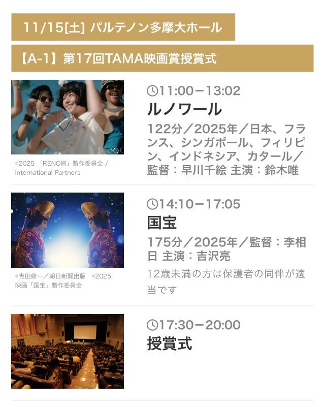 🎫第35回TAMA映画祭プログラム 11/15[土] パルテノン多摩大ホール 【A-1】第17回TAMA映画賞授賞式🏆 #長塚京三 さん、#吉沢亮 さん、#黒川想矢 さん、#中野有紗 さんなど、受賞者の皆さまが登壇✨ 『#国宝』、『#ルノワール』の上映も🎬 プログラム一覧はこちら👇 tamaeiga.org/2025/program/ pic.x.com/PQXCn6zbW8
