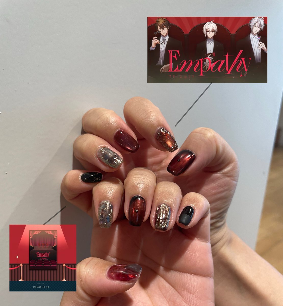TRIGGER記念日2025ネイルに変えてきた🥳ベースはEmpathyのボールドと黒にしつつ劇中のTRIGGERカラーもさりげなくいれてもらった🩶💓💙カテコのきらきら紙吹雪✨「TRIGGERの新曲が良すぎた…でも役要素もいれたい…」という下手すぎる説明でいつも期待以上に仕上げてくれる担当さんありがとーーー🥰🥰🥰 pic.x.com/E3QZf6Pj70