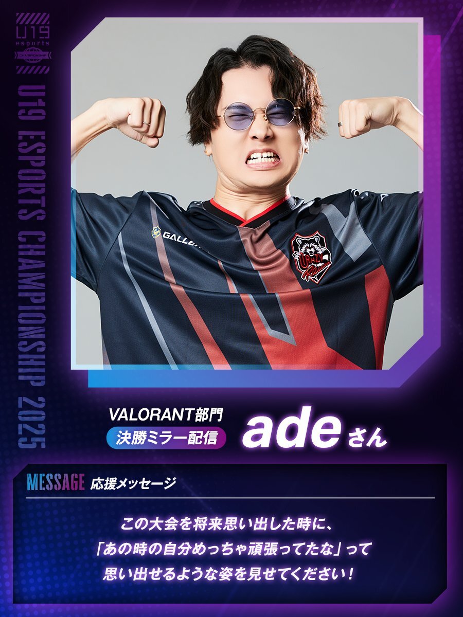 🎮U19eスポーツ選手権2025 決勝大会【VALORANT部門】をミラー配信してくれるのは…✨ 🟢 ade さん@ade3_) Crazy Raccoon所属のadeさんは、 VALORANTの世界大会への出場経験もある元プロプレーヤー❗ その確かな実力と心地よいトークで、 決勝大会をさらに熱く盛り上げていただきます🔥 pic.x.com/cRxWndPwr9