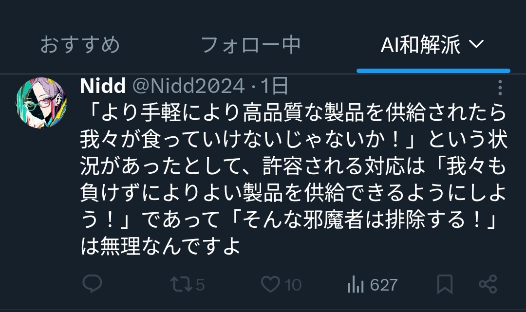 AI和解派って意味分からんよな。 それもうただの推進派だから。 和解を名乗る事であたかも「生成AIが正義の側にあり、規制は間違いでございました」であるかのように錯覚させようとする狡い奴でしかないんよ。 要するにただの工作員。