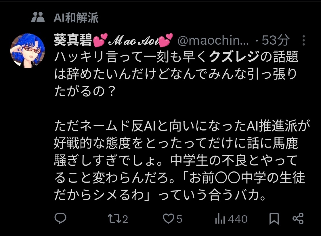 AI和解派の例のモデレーター、結局モデレーターアカウントでも生成AIユーザーに噛みついては独自の著作権法解釈を押し付けるわ人の話聞かないわで大暴れしてんじゃん まぁ他の人も議論にならなくて困ってるみたいだけど