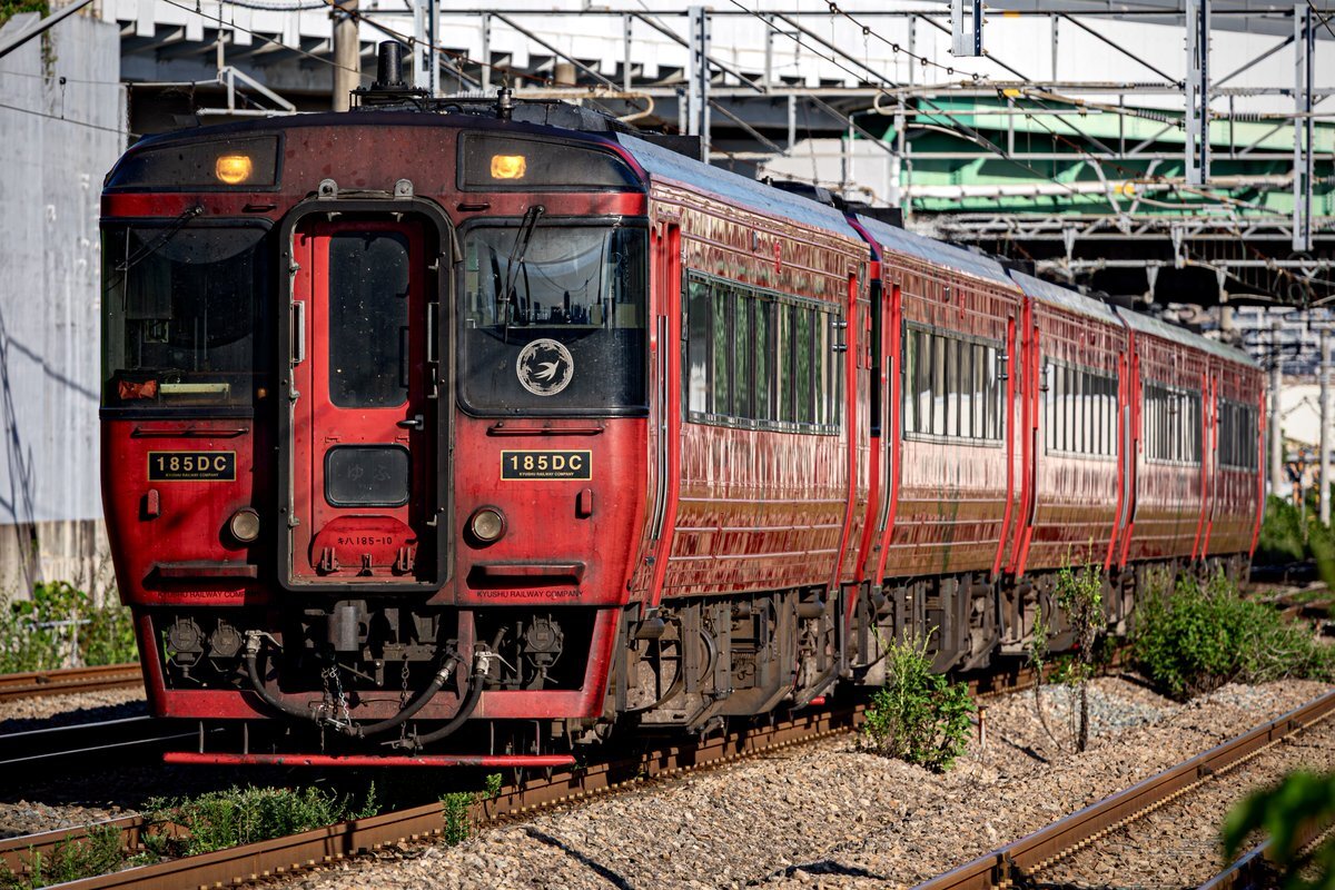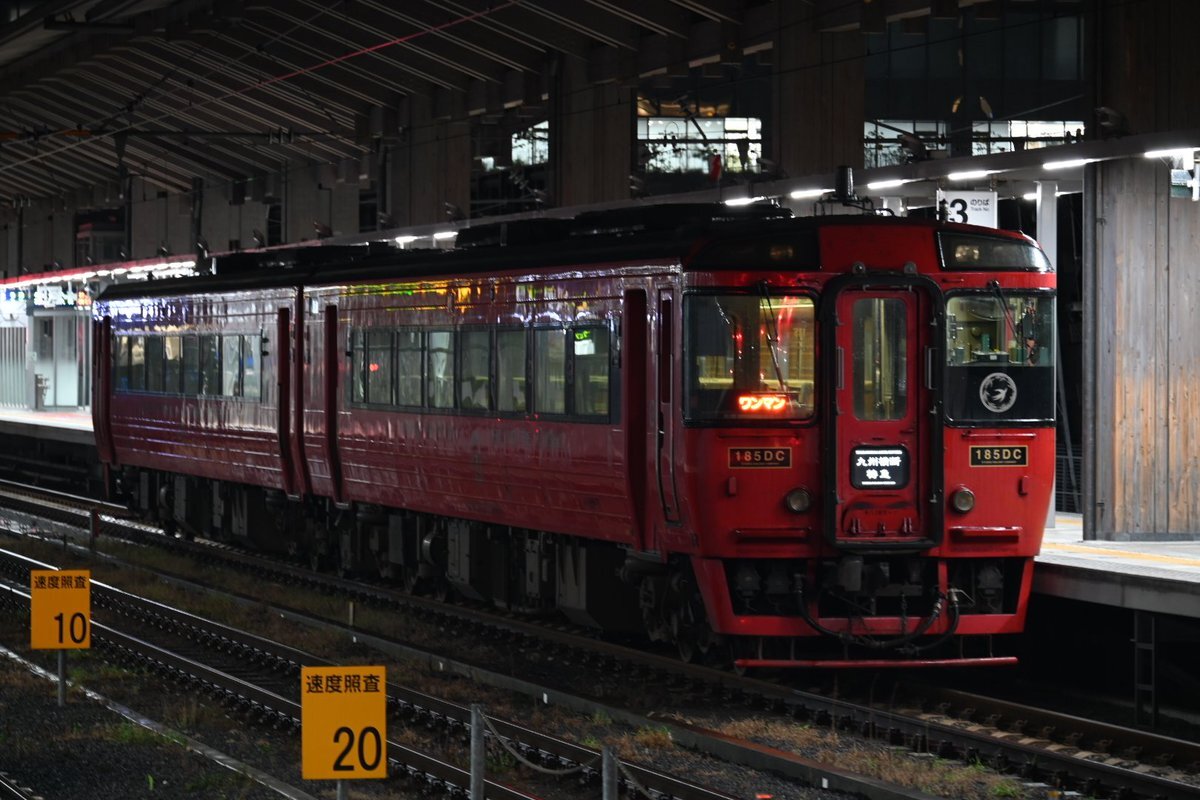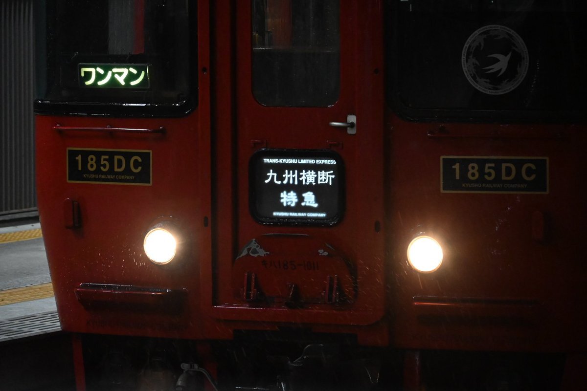 #おはようトレイン 10月23日 旅行3日目 熊本からスタート (今日の車両)JR九州キハ185系九州横断特急 本当は明るい時間に見たかったですが予定を 変更したので夜の到着便を撮影 キハ185系もFCLED側面幕使うんですね #JR九州 #キハ185系 pic.x.com/7zjckKon6z