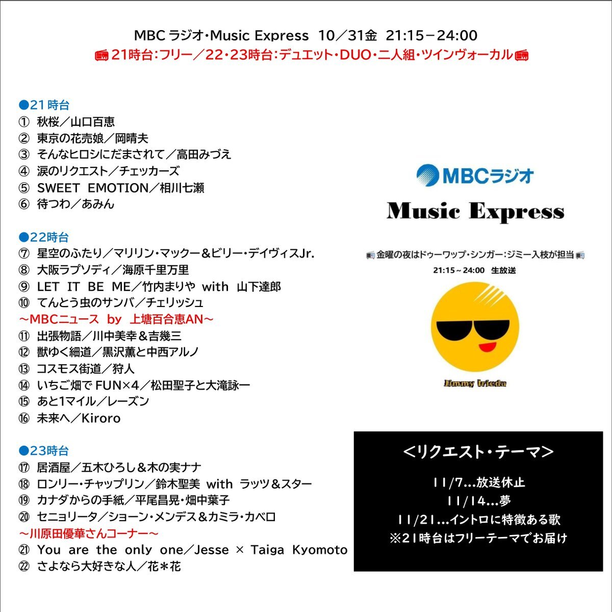 鹿児島・MBCラジオ Music Express #ミューエク 10/31金 21:15-24:00 DJ #ジミー入枝 NEWS #上塘百合恵 STAFF #川原田優華 21・22時台 radiko.jp/share/?sid=MBC… #獣ゆく細道 #黒沢薫 と #中西アルノ 23時台 radiko.jp/share/?sid=MBC… #Jesse #TaigaKyomoto #SixTONES pic.x.com/rn9Mi7xtVB